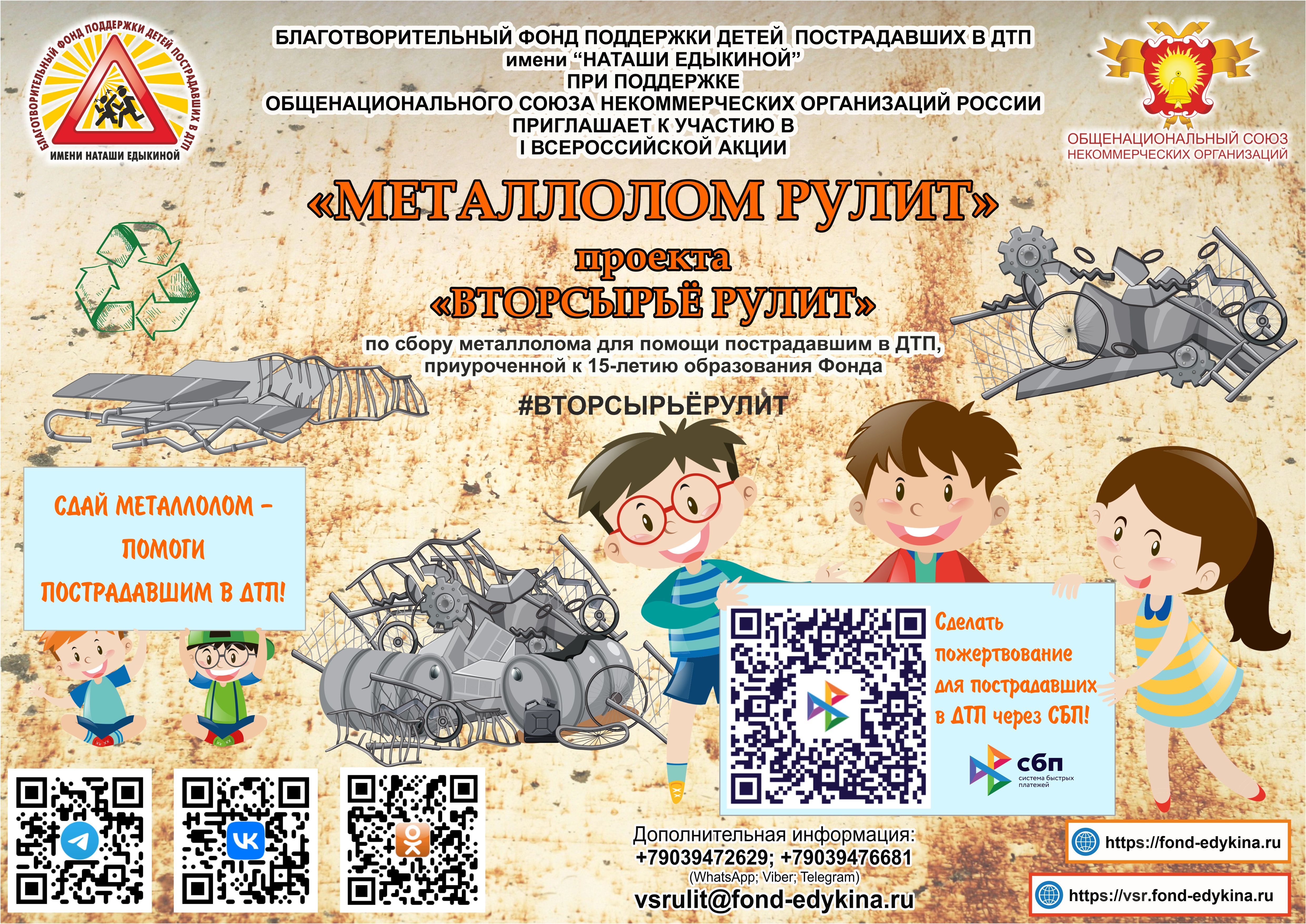 БЛАГОТВОРИТЕЛЬНЫЙ ФОНД ПОДДЕРЖКИ ДЕТЕЙ ПОСТРАДАВШИХ В ДТП ИМЕНИ «НАТАШИ ЕДЫКИНОЙ» ПРИ ПОДДЕРЖКЕ ОБЩЕНАЦИОНАЛЬНОГО СОЮЗА НЕКОММЕРЧЕСКИХ ОРГАНИЗАЦИЙ РОССИИ ПРИГЛАШАЕТ К УЧАСТИЮ В I ВСЕРОССИЙСКОЙ АКЦИИ «МЕТАЛЛОЛОМ РУЛИТ» проекта «ВТОРСЫРЬЁ РУЛИТ» по сбору металлолома для помощи пострадавшим в ДТП, приуроченной к 15 – летию образования фонда #ВТОРСЫРЬЁРУЛИТ