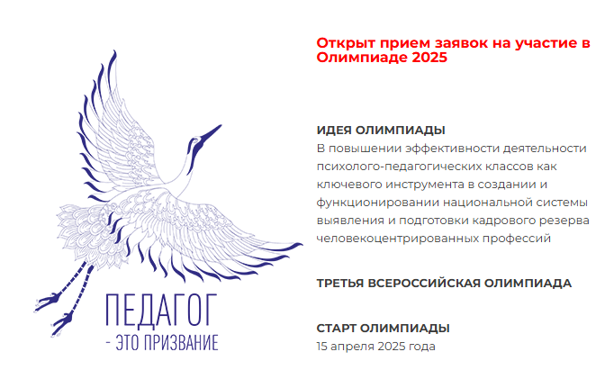 Заочный тур третьей Всероссийской олимпиады «Педагог - это призвание» (далее - Олимпиада) продлится до 30 августа 2025 года: https://ped-olimp.ru/